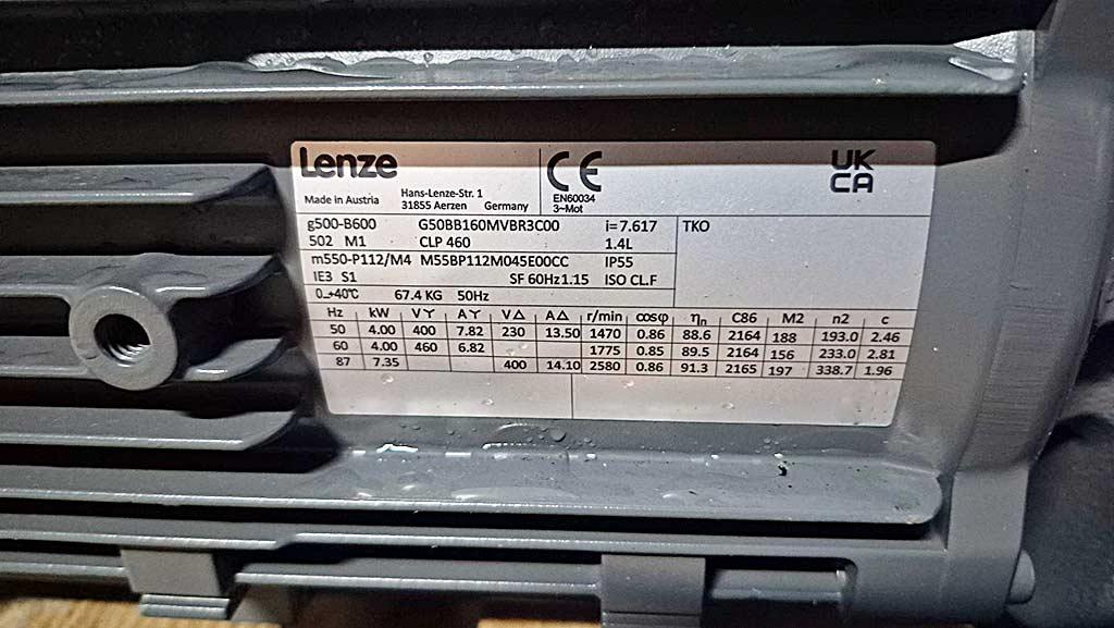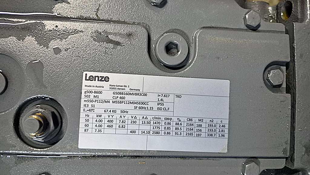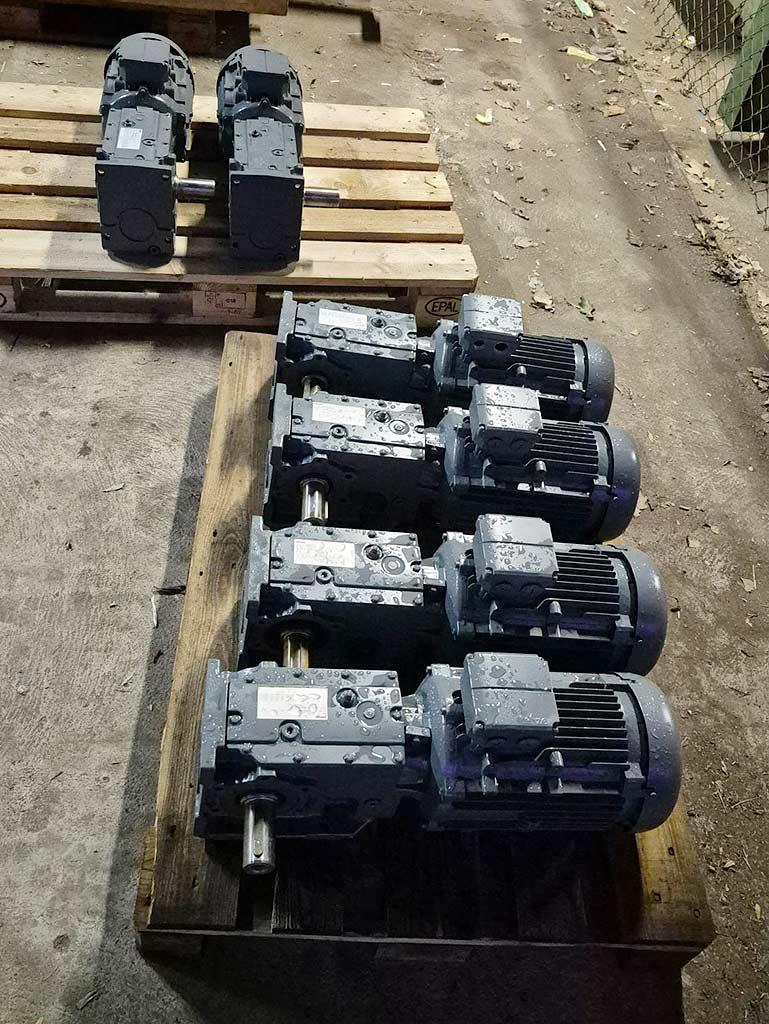 Six geared motors Lenze in mint condition are available. Gear ratio: 7.617, motor type: G50BB160MVBR3C00, oil type: CLP 460, oil quantity: 1.4l, degree of protection: IP55, insulation class: F, efficiency class: IE3, operating mode: S1, max. power: 7.35kW, max. speed: 2580rpm, weight: approx. 70kg. An on-site inspection is possible.